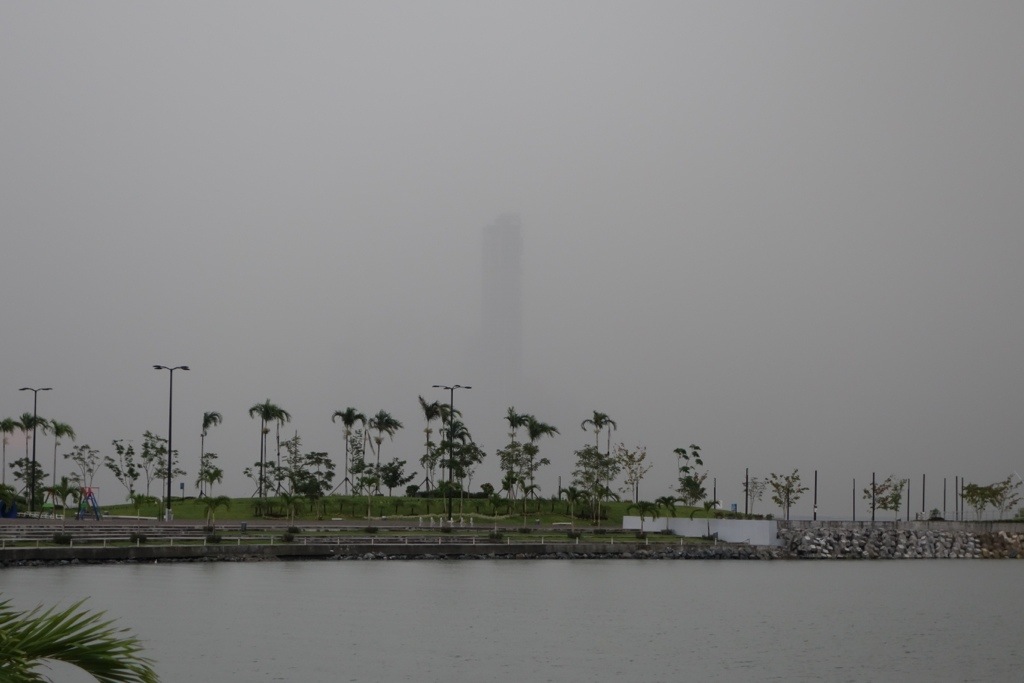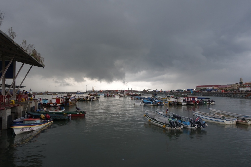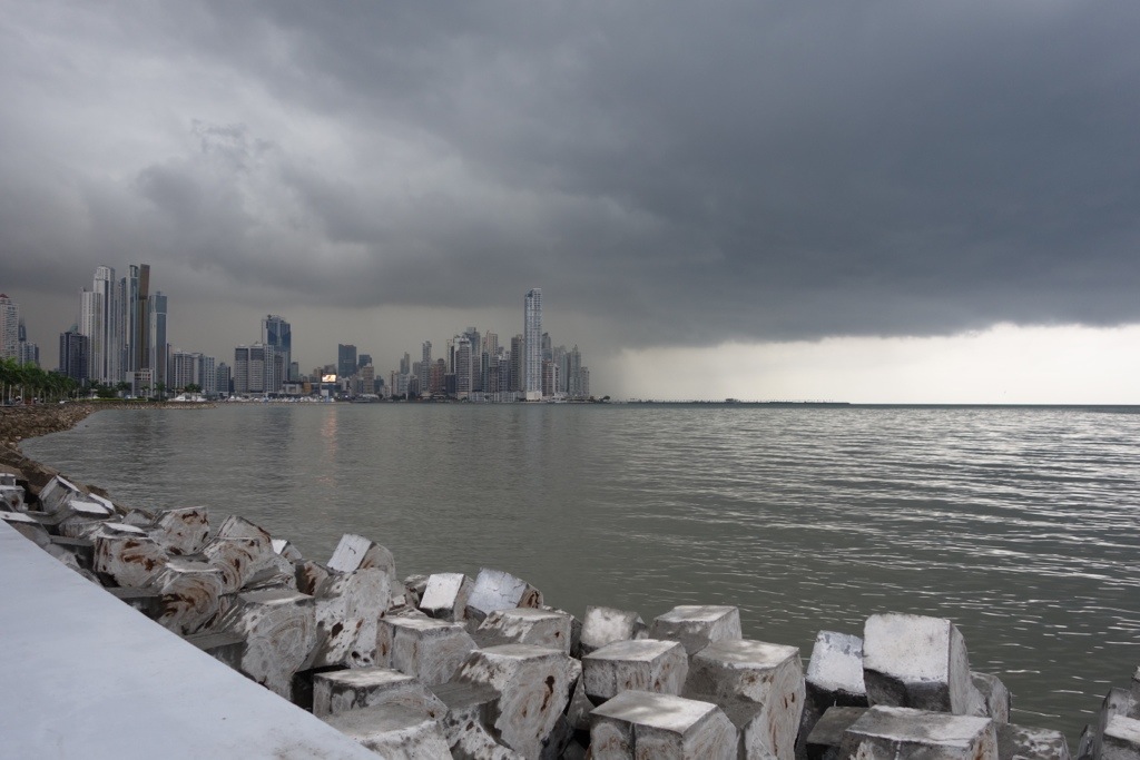 Spitzen Idee, hier ist nämlich Regenzeit, stellte ich nach etwa 200 Schritten fest. Ich schwitze wie ein Walross in der Atacama-Wüste, die Luftfeuchtigkeit ist so hoch, trotz mäßiger Temperaturen – aber die Regentropfen erreichen trotzdem meine Haut (auch wenn sie innerhalb von einer Minute wieder verdunsten). Ich laufe trotzdem durch den Regen und genieße den mystischen, weil knisternd-stürmischen Anblick auf die Pazifikküste der Stadt, die Skyline und die vielen Schiffe, die sich langsam einreihen, um den schmalen Zuffahrtsweg des Panamakanals zu passieren.