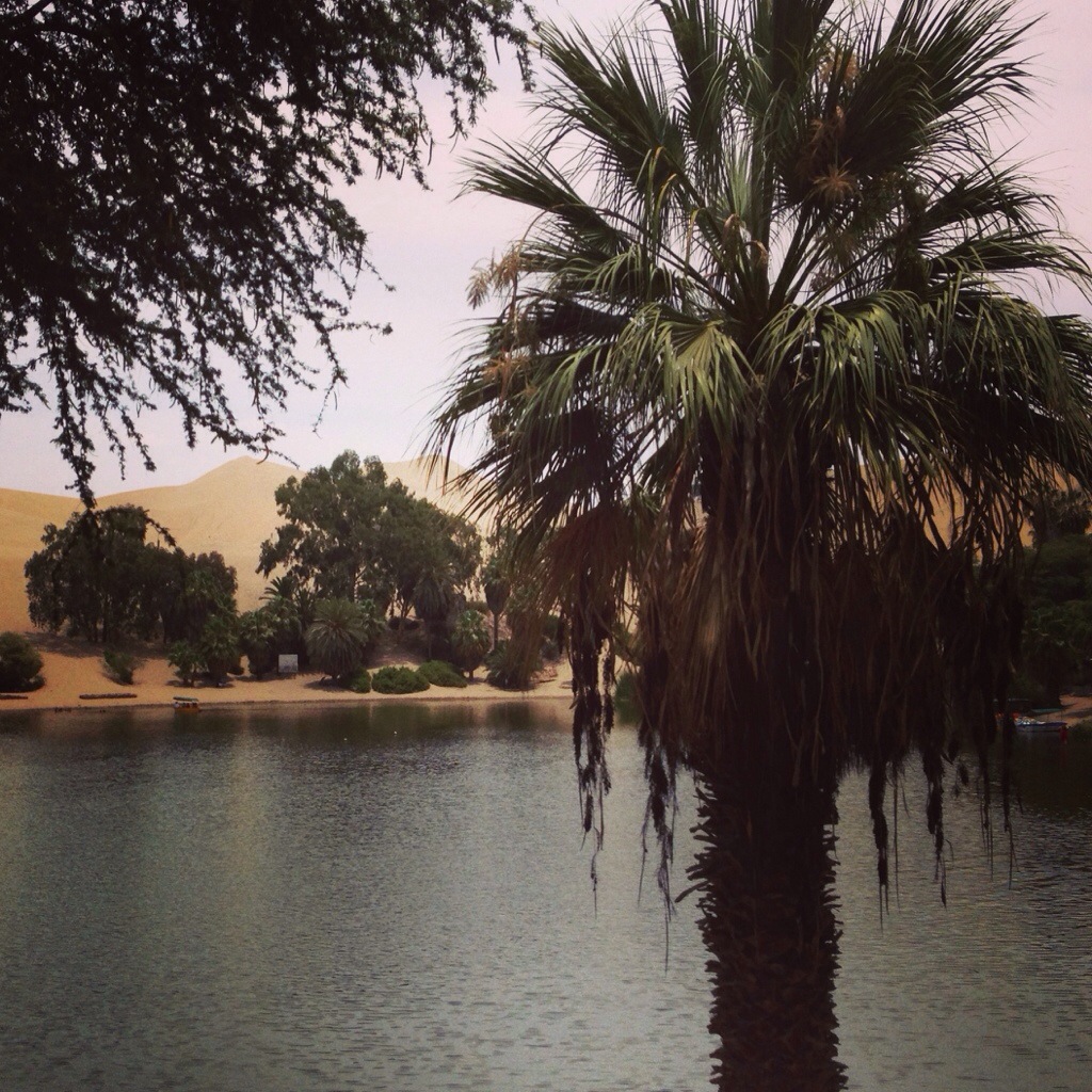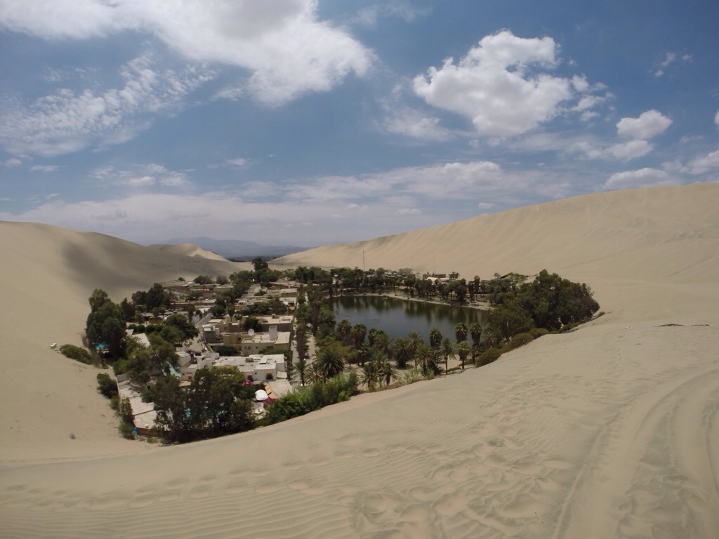 Am nächsten Tag geht es für mich nach Huacachina weiter, einer kleinen Oase inmitten den langgezogenen Sanddünen der Atacama-Wüste. Genaugenommen liegt in Sichtweite die nächstgrößere Stadt Ica, um die man aber aufgrund der Tatsache, dass es dort absolut nichts zu sehen gibt, gleich einen riesen Bogen machen kann. Dafür ist die Oase umso spektakulärer, befindet sich doch im Zentrum der 180-Einwohner-Einöde ein kleiner, glasklarer Weier. Natürlich ist auch Huacachina von hohen Sanddünen umgeben, die einen Rahmen um das Fabeldorf spannen. Von hier aus fahren die Touristen Sandboard oder kämpfen sich zu den zahlreichen Aussichtspunkten hoch. Die Sicht sucht Ihresgleichen und so ein Sonnenuntergang in der Wüste macht immer was her.