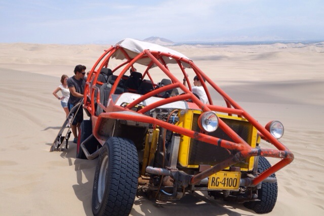 Anstatt mit Kamelen bewegt man sich in der Wüste allerdings mit Buggys fort und bucht eine von unzähligen Touren inklusive Sandboarding-Einheiten. Achterbahnähnliche G-Kräfte wirken auf den Körper, der sich, natürlich gut angeschnallt, in der wilden Achterbahnfahrt ähnlich hin und her Bewegt, wie Protagonisten in der Zeitlupen-Bus-Szene aus Inception. Nur eben nicht in Zeitlupe. Meine GoPro hat sich natürlich nicht lumpen lassen und war dabei. Auf dem Weg nach Huacachina habe ich übrigens drei Belgier kennengelernt, die sich mir angeschlossen haben und wir sind auf Empfehlung im “Carola del