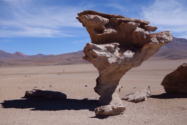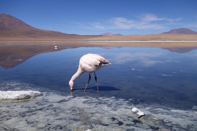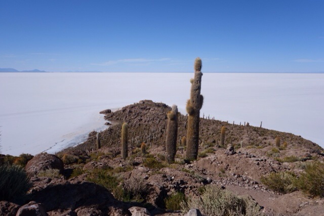 Nur wenig später, am Rand der Uyuni Salzwüste, wechselt die Landschaft plötzlich dramatisch: von blau-, rot- und weißen Lagunen, gefüllt mit Magnesium, Salz und anderen Mineralien, bis hin zur roten Marslandschaft, riesigen grünen Kakteen, Vulkanen und einer felsbedeckten Wüste, die Salvador Dali schon als Inspiration für seine Bilder diente. Hier in Bolivien fühlt man sich wie in einem Traum. Nachts sind die Sterne auf fast 5000 Höhenmetern und fernab von Allem so klar und strahlend wie sonst fast nirgendwo auf der Welt. Im Salzhotel übernachtet unsere sechs Mann/Frau starke Gruppe gemeinsam im Bettenlager, morgens geht es Herrgottsfrüh los zu den Tagestouren.