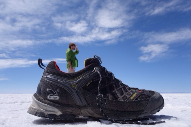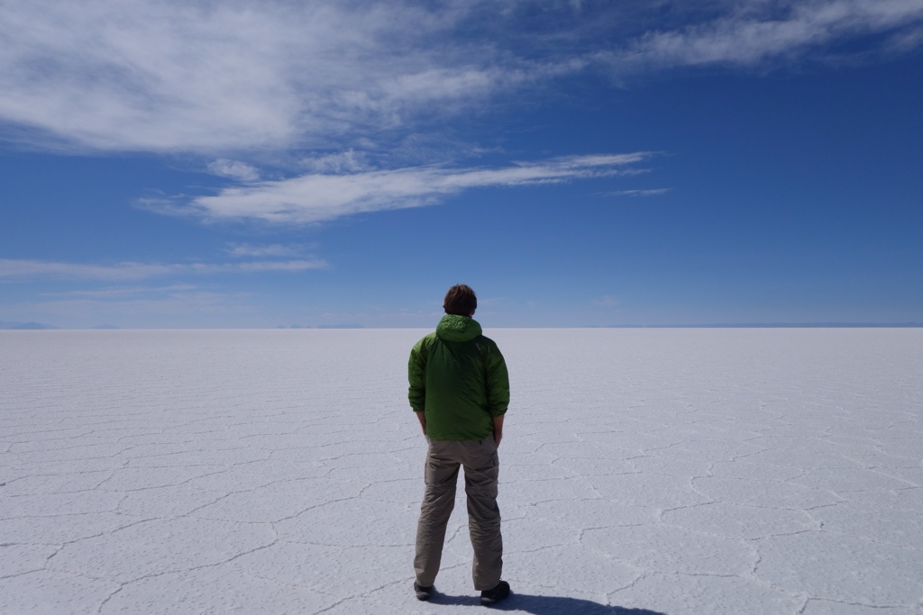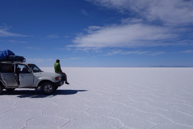 Wenn man plötzlich in Mitten einer schier endlosen Salzwüste steht, keine Tiere, keine Bauten, keine Menschen weit und breit, nur endloses Weiss, blauer und strahlender Himmel und eine leichte Brise im Gesicht – dann wird man wirklich andächtig und poetisch. Es ist absolut surreal: man muss es sich so vorstellen, wie wenn all Menschheit längst vergangen ist, die Erde langsam von der Sonne verzehrt wird, in Millionen von Jahren. Wüst und leer und komplett flach. Hier war Mal Meer. Bis die tektonischen Platten (achtung, kein Tanzstil) sich gegenseitig in die Höhe schiebten und das Wasser der Schwerkraft zum Opfer fiel. Geblieben sind nur die Salzablagerungen, die sich in Form fünfeckiger Kacheln die stabilste Form gesucht haben. Unser Jeep freut sich über den griffigen und immerflachen Untergrund.