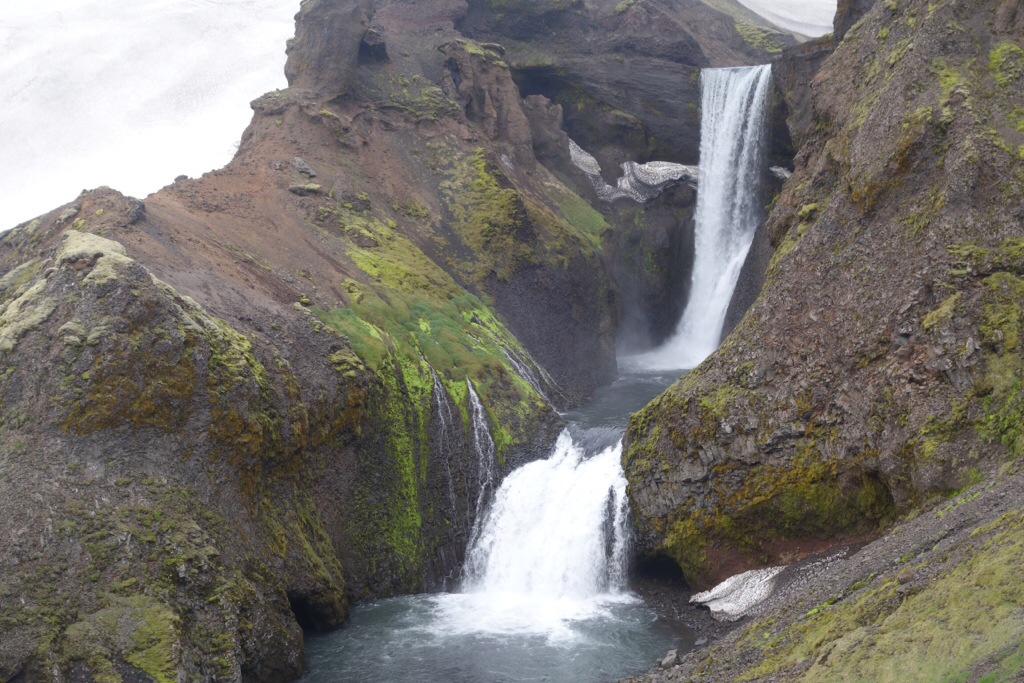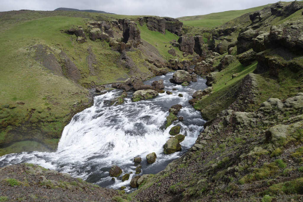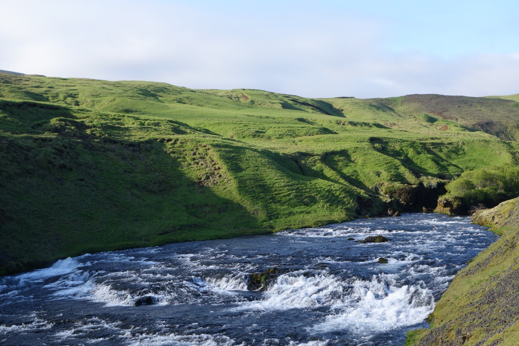 Die weiß-grau schimmernden Gletscherspalten zieren schon von Weitem den Anblick der hyperaktiven Zunge, die im Laufe des letzten Jahrhunderts ebenfalls um mehrere 100 Meter an Länge und in einer Zeitspanne von 5 Jahren mancherorts etwa drei Meter an Höhe verloren hat. Da soll nochmal einer sagen es gäbe keinen Klimawandel… Der als Mittelschwer gekennzeichnete Anstieg erscheint mir nach Ecuador wie der reinste Kindergeburtstag, auf Eis gehen und klettern macht hier einfach einen Heidenspaß. Große Spalten zu meiner Rechten und Linken pflastern meinen Weg, überall plätschern kleine Wasserströme den Hang herab, bilden unterirdische Tunnel. “Wo ist hier der Gullideckel?”, frage ich mich, als ich versuche das tief fallende Plätschergeräusch zu orten. Wer durstig ist, kann hier seine Flasche problemlos in die Spurrinne halten und erfrischendes, maximalsauberes Gletscherwasser einfüllen. Und auch geschmacklich spielt das Wasser hier oben in der Championsleague. Wer in Island für Wasser bezahlt ist einfach ein Depp – das wächst hier wirklich überall auf Bäumen. Natur pur. Auf dem Weg nach unten wandert der Blick vom Eis weg auf die grün bedeckte Küstenebene von Skaftafell. Was für ein Trip. Es geht weiter.
