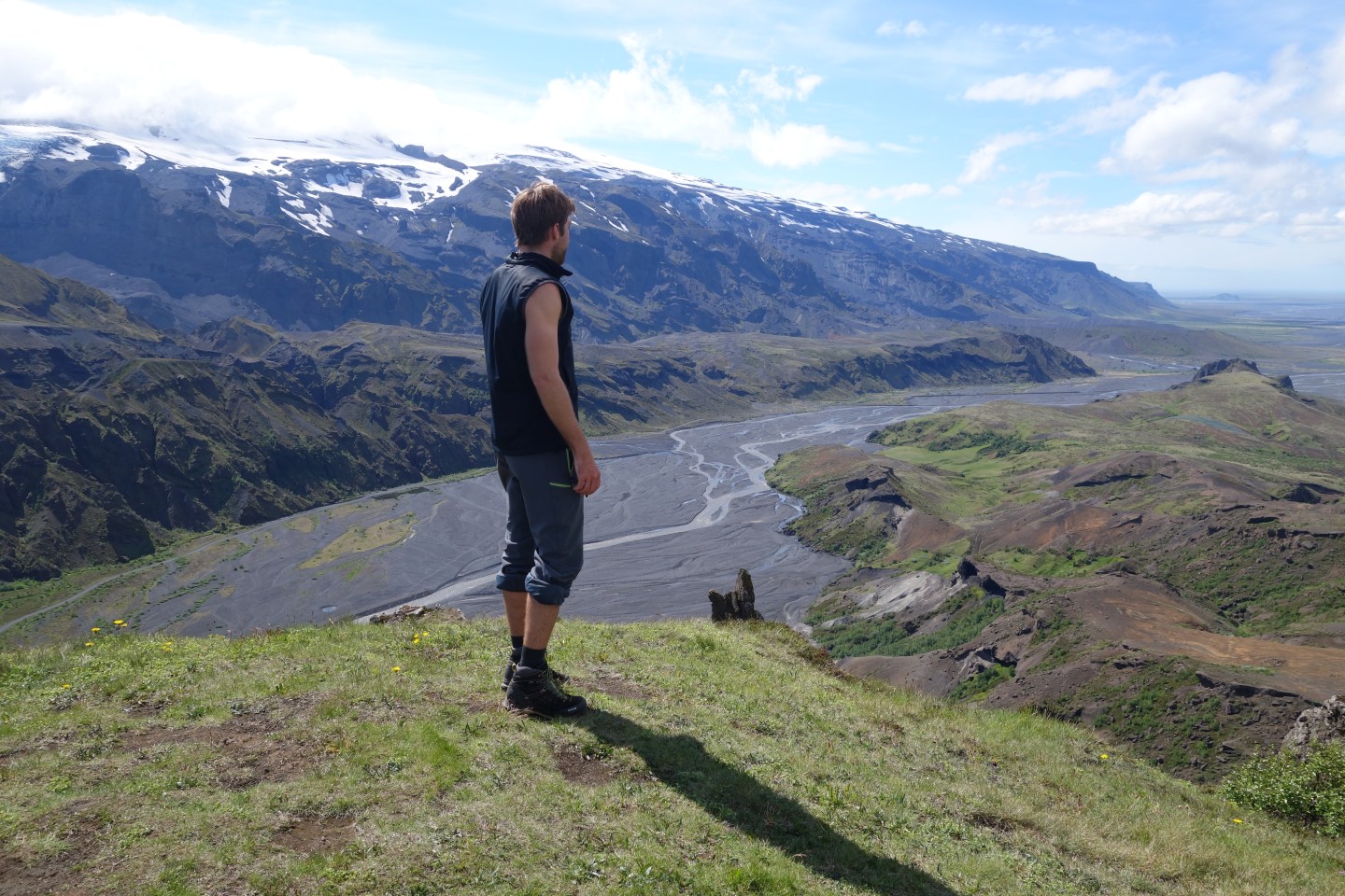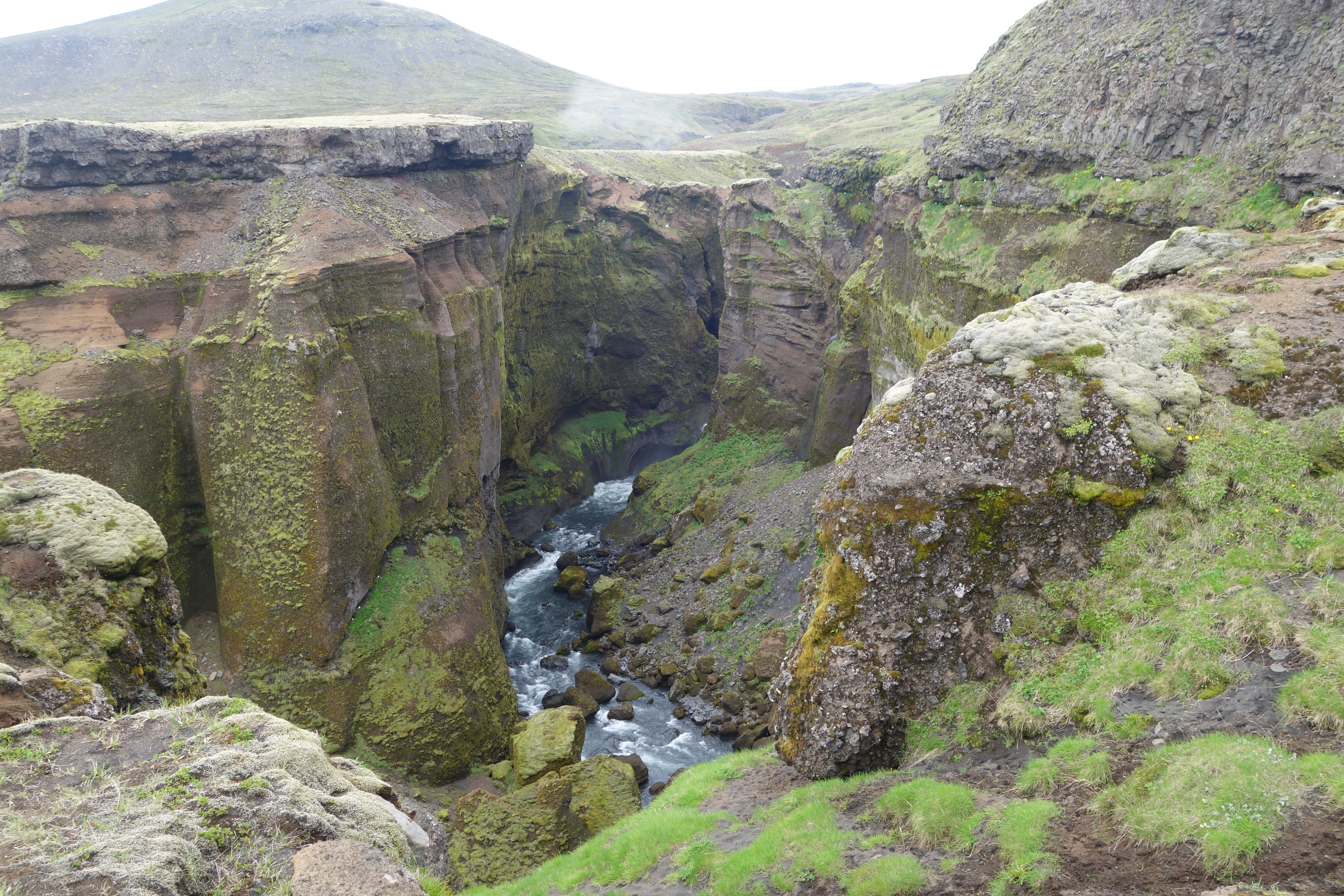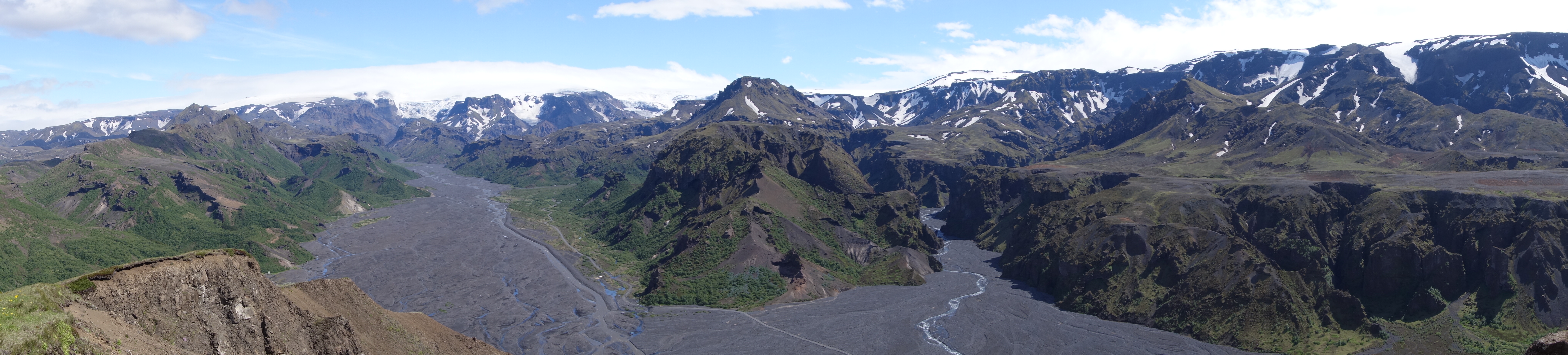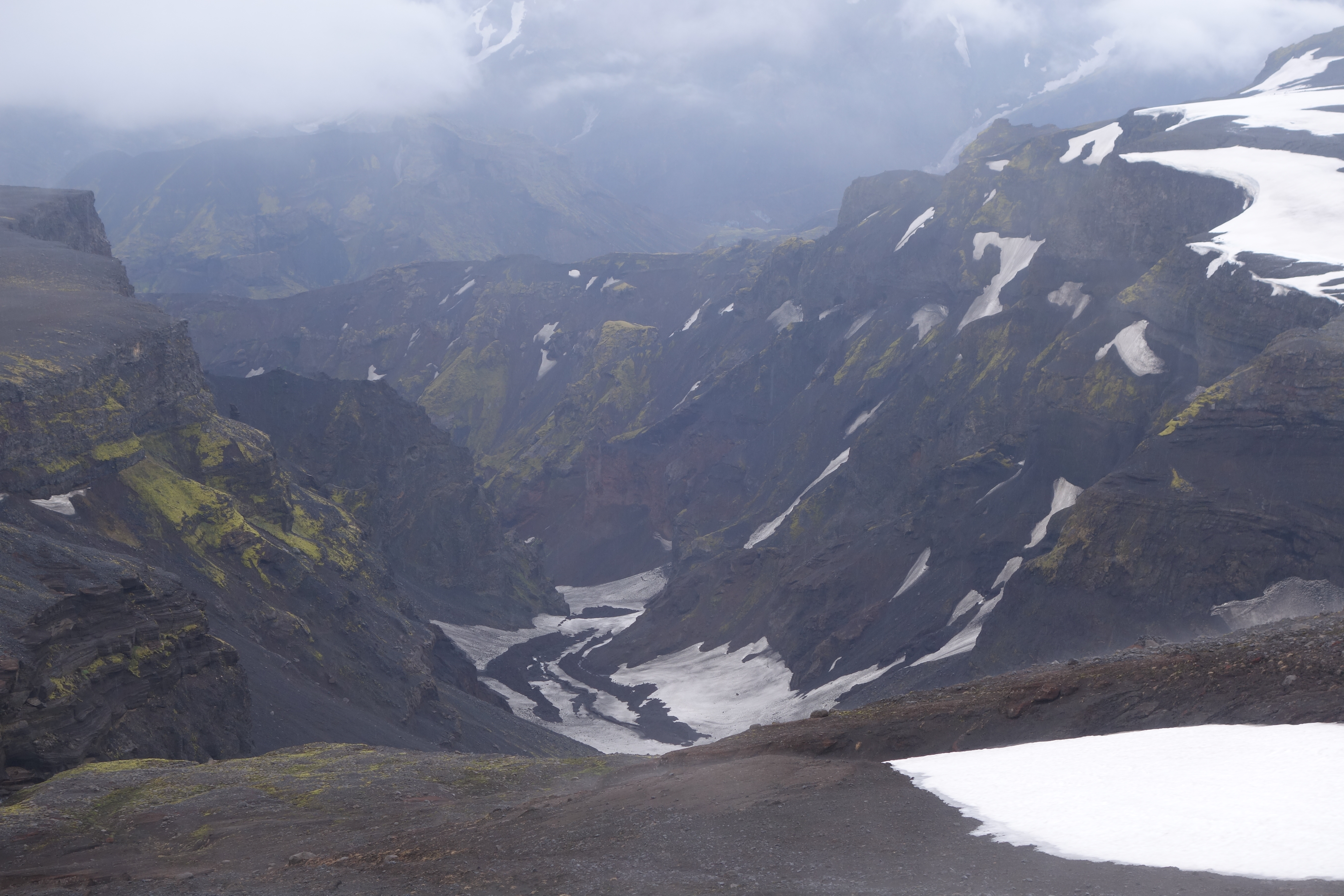 Hier lerne ich allerdings schnell, dass die blau gekennzeichneten Pfade wie beim Skifahren für einfache, und die roten für extrem schwere und anspruchsvolle Wanderwege stehen. Ich gehe natürlich unwissend und zielstrebig die roten Pfade entlang, die mich an schmelzenden Eisplatten vorbei, durch matschigen und schwergängigen Schnee hindurch, viele sehr steile Hügel empor führen. Mein Material ist gut und hält die längste Zeit über den widrigen Bedingungen stand. Allerdings gibt auch der beste Schuh irgendwann seinen Geist auf und nach etwa vier Stunden kommt der Moment, an dem ich mich langsam nach einer warmen Hütte umschaue. Hier oben ist von grün nämlich keine spur mehr, und auch die Sonne verschwindet hinter den tief liegenden Wolken und Nebelschwaden. Die Hütten habe ich längst hinter mich gelassen. Eigentlich müsste ich ja über diese Tour lachen, nach all dem, was ich in Ecuador hinter mich gebracht habe. Trotzdem bringt mich das schwere Gepäck, ich habe Zelt, Schlafsack, Isomatte, Gaskocher und Nahrungsmittel sowie ein paar Klamotten dabei, in Kombination mit den Witterungsbedingungen so ganz langsam an meine Grenzen. Nicht eine Menschenseele kreuzt meinen Weg die rote Piste entlang und erst als das Eis so langsam wieder aus meinem Sichtfeld verschwindet, begegne ich einem Kanadier. Ich sei nur noch rund zwei Stunden entfernt von þorsmórk, sagt er. Und es ginge viel bergab. Trifft sich gut, denn bergauf kann ich nicht mehr, und zurück ist keine Option. Außerdem ist es hier überall so unglaublich schön, wenn das keinen Antrieb gibt weiterzumachen, was dann? “Ein Bad in einer der heißen Quellen”, beantworte ich meine rhetorische Frage selbst. Wie sich später herausstellen sollte, bin ich in þorsmórk allerdings noch eine Weile entfernt von heißen Quellen. Als ich mich endlich auf der Zielgeraden befinde und sich die spektakuläre Kulisse von þorsmórk zu meinen Füßen ausbreitet, bekomme ich Gänsehaut (was vielleicht auch der Kälte zuzuschreiben ist) und freue mich wie ein Schnitzel, durchgehalten zu haben. Wie nur hätte ich mit dem Marschgepäck weitere drei Tage durchstehen sollen? Am Camp angekommen stellt sich heraus, dass die meisten Menschen zwei Tage von Skógar hierher einplanen und in einer der Hütten entlang der blauen Pisten übernachten. Ich sei wohl geflogen, schüttelt die Gruppe junger Franzosen ungläubig den Kopf. Aaaaah. Jetzt. Okay. Das erklärt einiges.